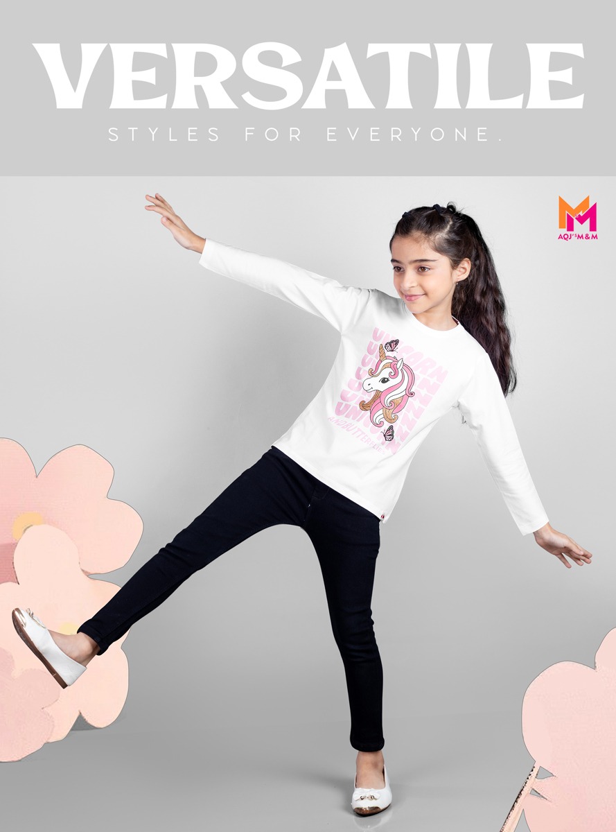 White and pink T-shirt for Girl Unicorn printed Regular length Round neck Full Sleeves