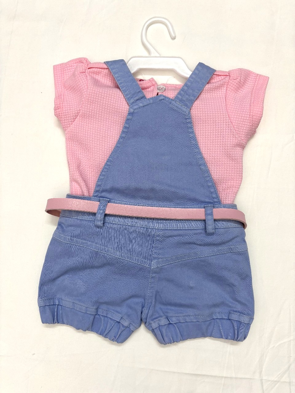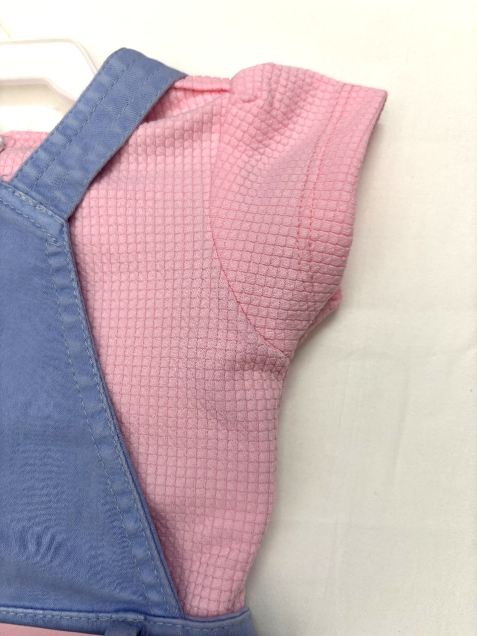pink & blue dungarees, has adjustable suspenders, two pockets, anwaistband and