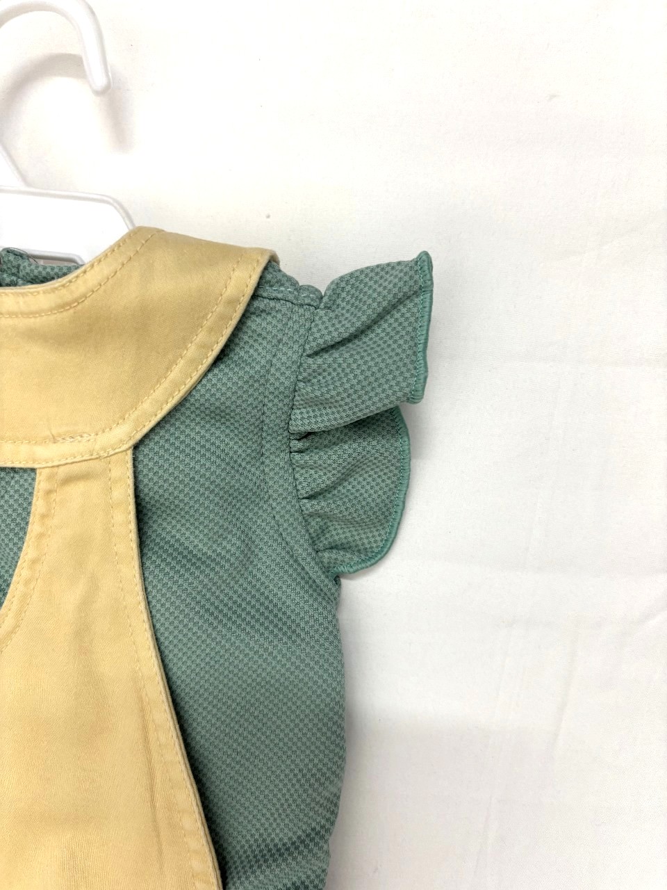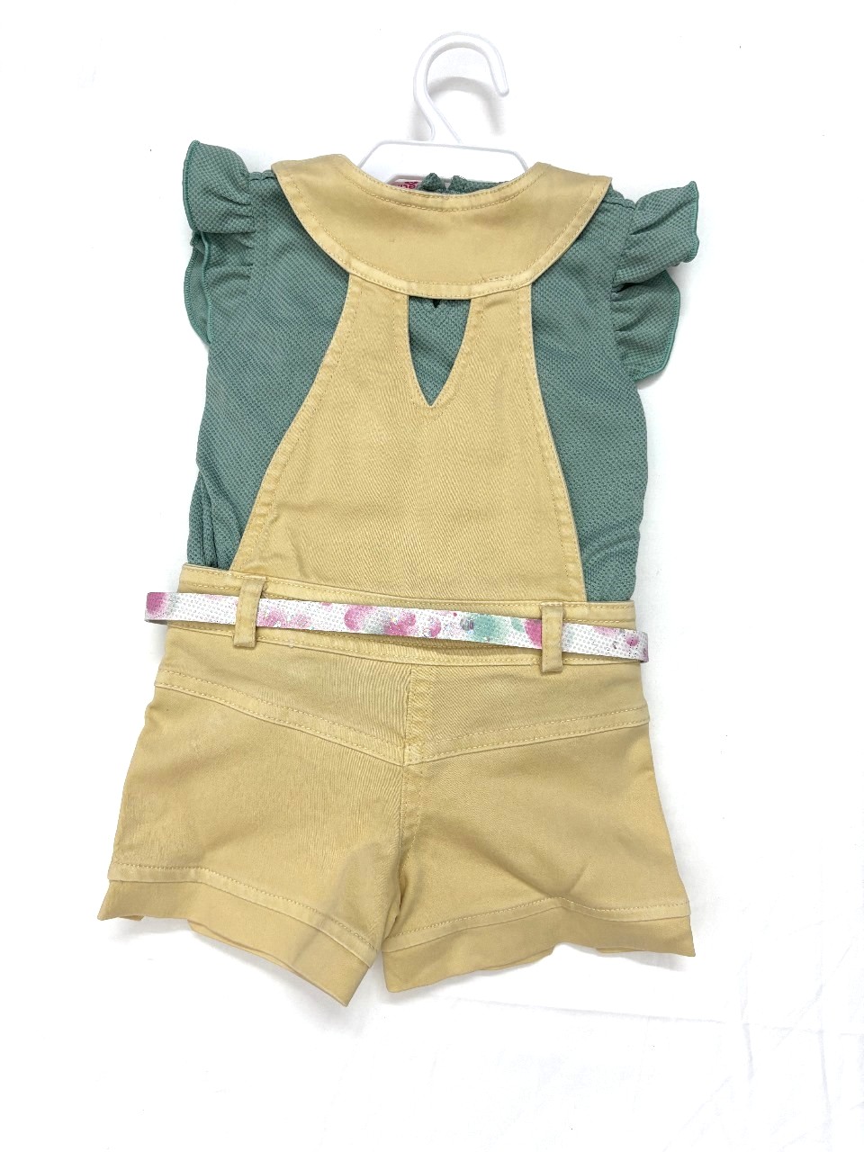 yellow & green dungarees, has adjustable suspenders, two pockets, anwaistband and