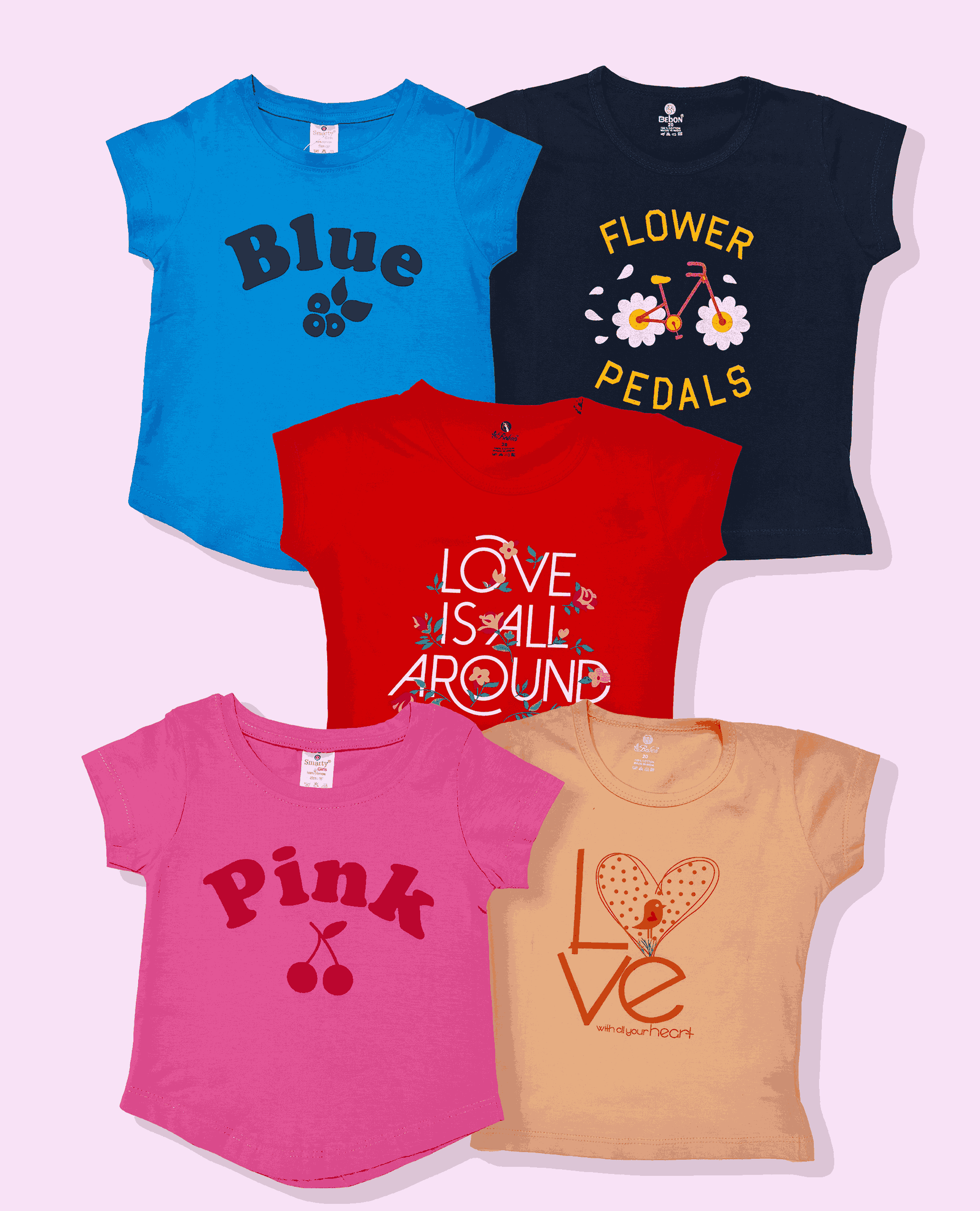 Pack of 5 Round neck cotton T-shirts for girls Graphic printed Regular length apple cut &