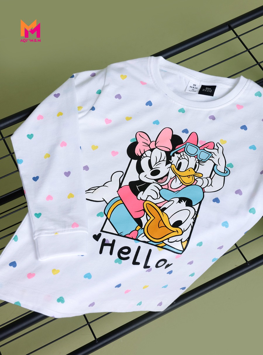 White Color Cotton Knit Regular Fit Minnie & Friends Heart Printed Regular Length Round Neck Full Sleeve Casual Wear T-shirt