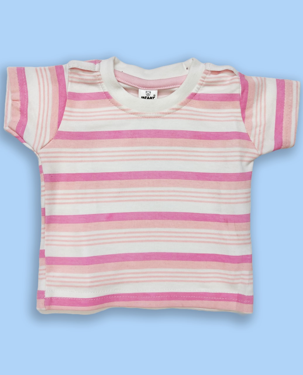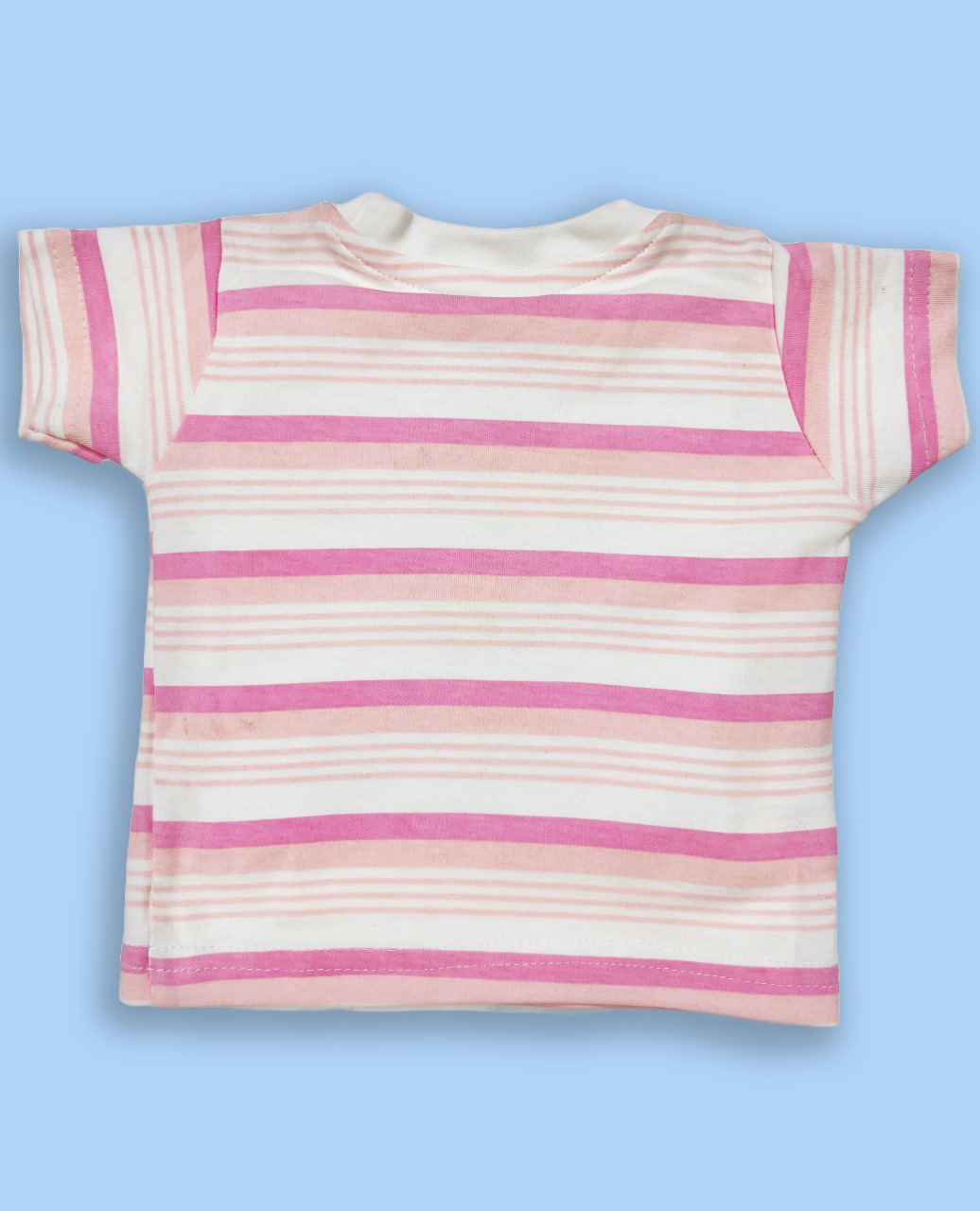 Comes with a pink-coloured strip T-shirt, has a round neck with short sleeves
